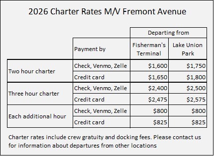 Fees for private charters include an hourly rate for the crewed boat, plus docking fees (higher at Lake Union Park) and a gratuity for the hard-working crew. Rates are a bit higher for special events, and we may need to charge extra if we are cruising one-way or meeting your party someplace other than our base at Fisherman’s Terminal or at Lake Union Park. Here are basic rates for 2026.